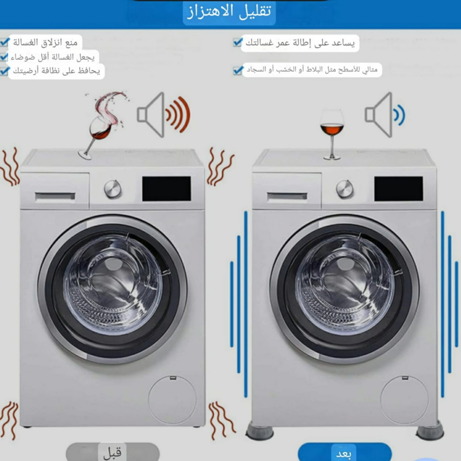 مضادة للاهتزاز والانزلاق : هذه الوسادات مناسبة بشكل أساسي لصدمات الغسالة. تعمل خاصية امتصاص الاهتزاز على تقليل الضوضاء الناتجة عن عدم استقرار الغسالة أو المجفف، مما يوفر حماية للأرضية.